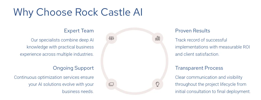 Rock Castle AI stands out from other providers through our combination of cutting-edge technology and human expertise. We deliver fully customized solutions rather than generic AI products, with implementation specialists who understand your industry's unique challenges. Unlike competitors focused solely on algorithms, we prioritize business outcomes with transparent pricing, measurable ROI, and ongoing optimization services that ensure your AI solution evolves with your business needs and market conditions, creating a true strategic partnership rather than just a technology vendor relationship.